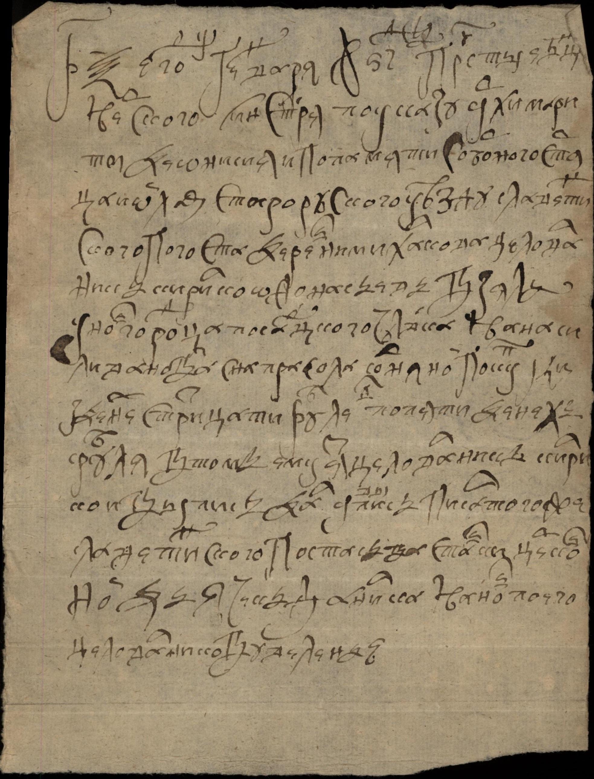 Данил Иванов, дьячок церковный, писец. Выпись из таможенной книги таможенного целовальника деревни Михалково Славитинского погоста Старорусского уезда Кирилла Афанасьева новгородскому посадскому человеку прасолу Ивану Селиванову сыну о получении с него по указу архимандрита Иверского монастыря Дионисия и по памяти соборного старца Иоиля пошлины с купленного товара. 1657 г. января 16. Архив СПбИИ РАН. РС. Ф. 132. Оп. 1. Картон 4. Д. 247. Л. 1.