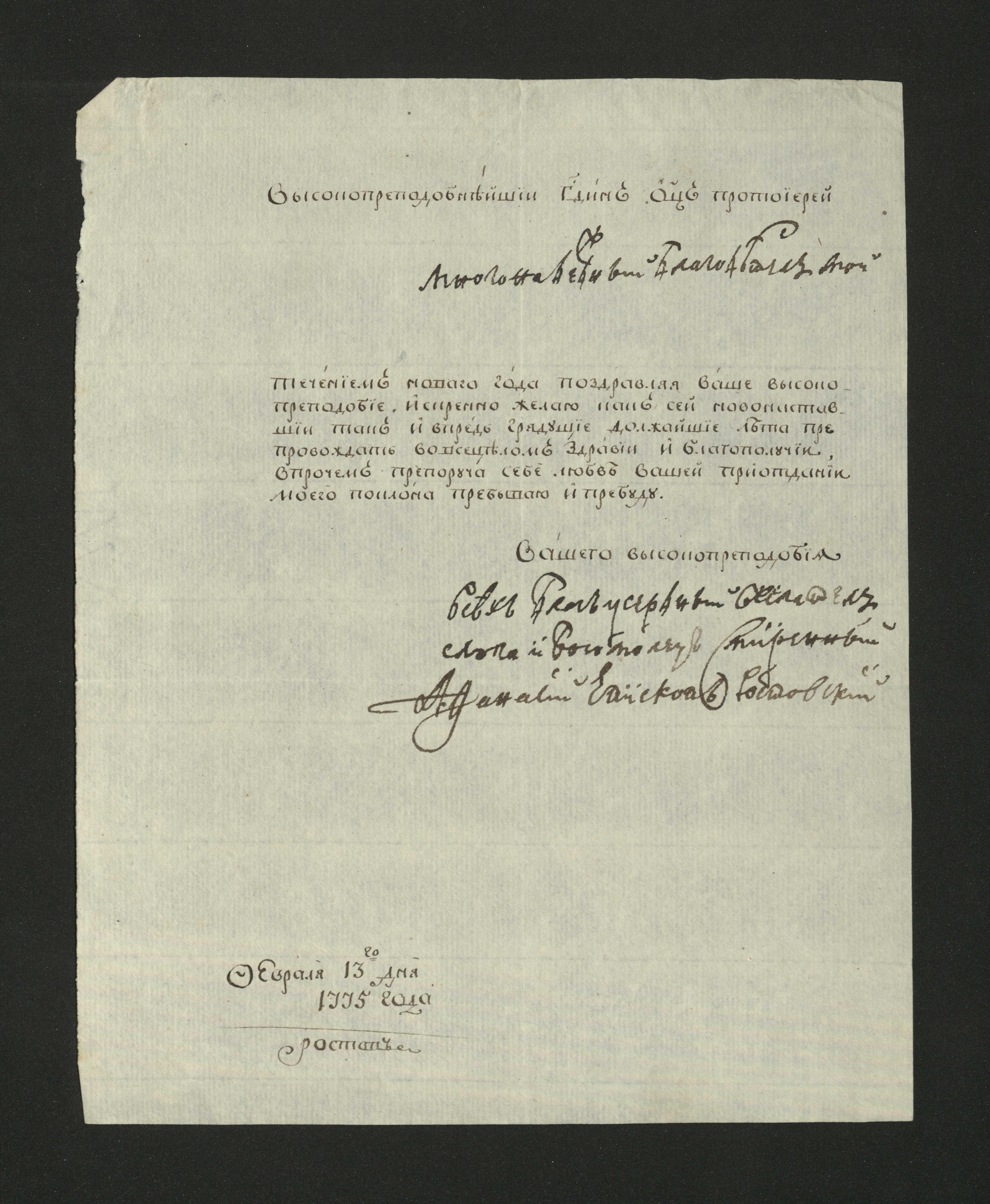 Поздравительное письмо епископа Афанасия неизвестному протоиерею. 13 февраля 1776. Архив СПбИИ РАН. Колл. 238. Оп. 2. Карт 269. Ед. Хр. 89. Л. 1.