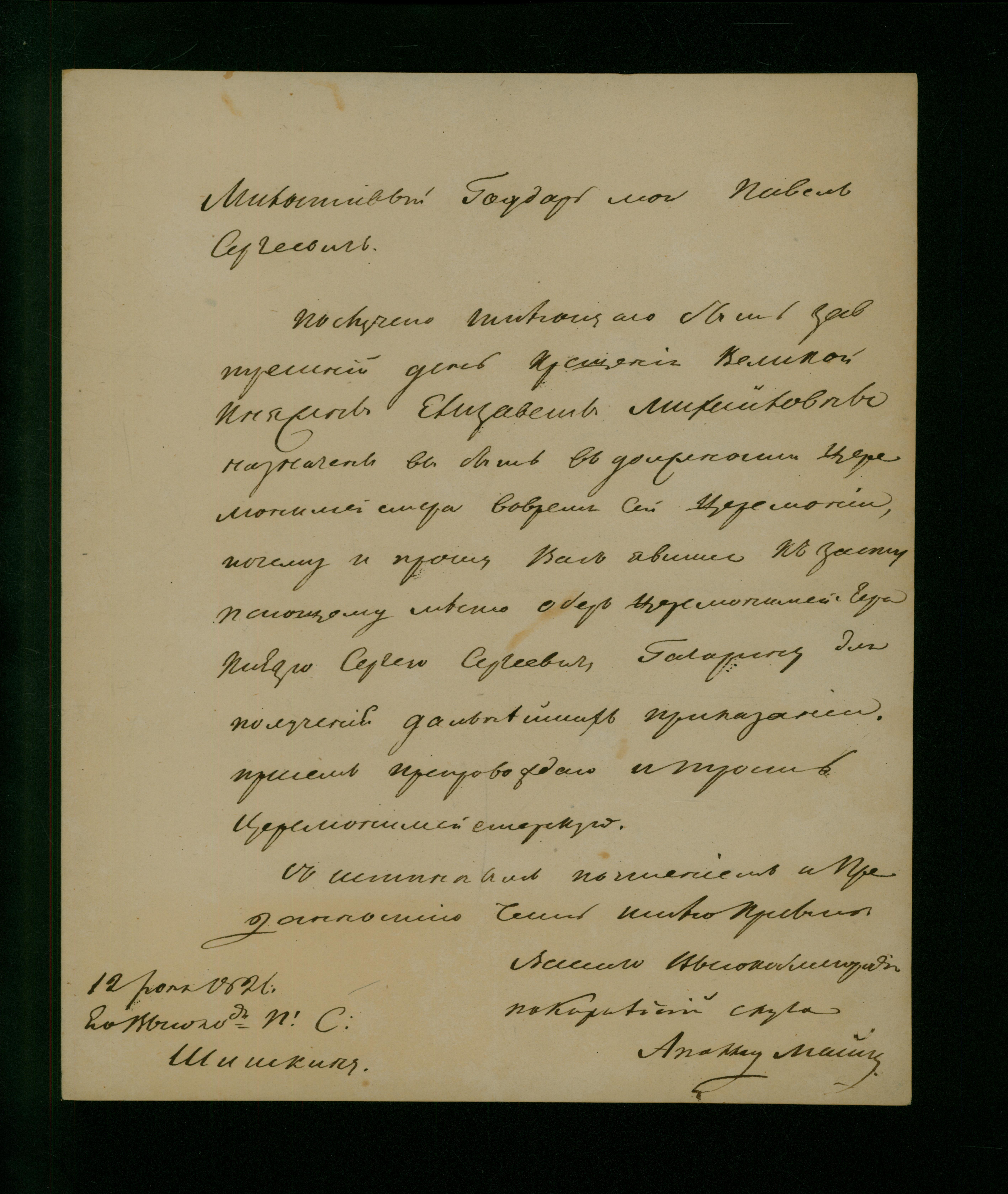 Письмо А. А. Майкова П. С. Шишкину. 12 июля 1826 г. Архив СПбИИ РАН. РС. Кол. 238. Оп. 2. Ед. хр. 275/2. Л. 1