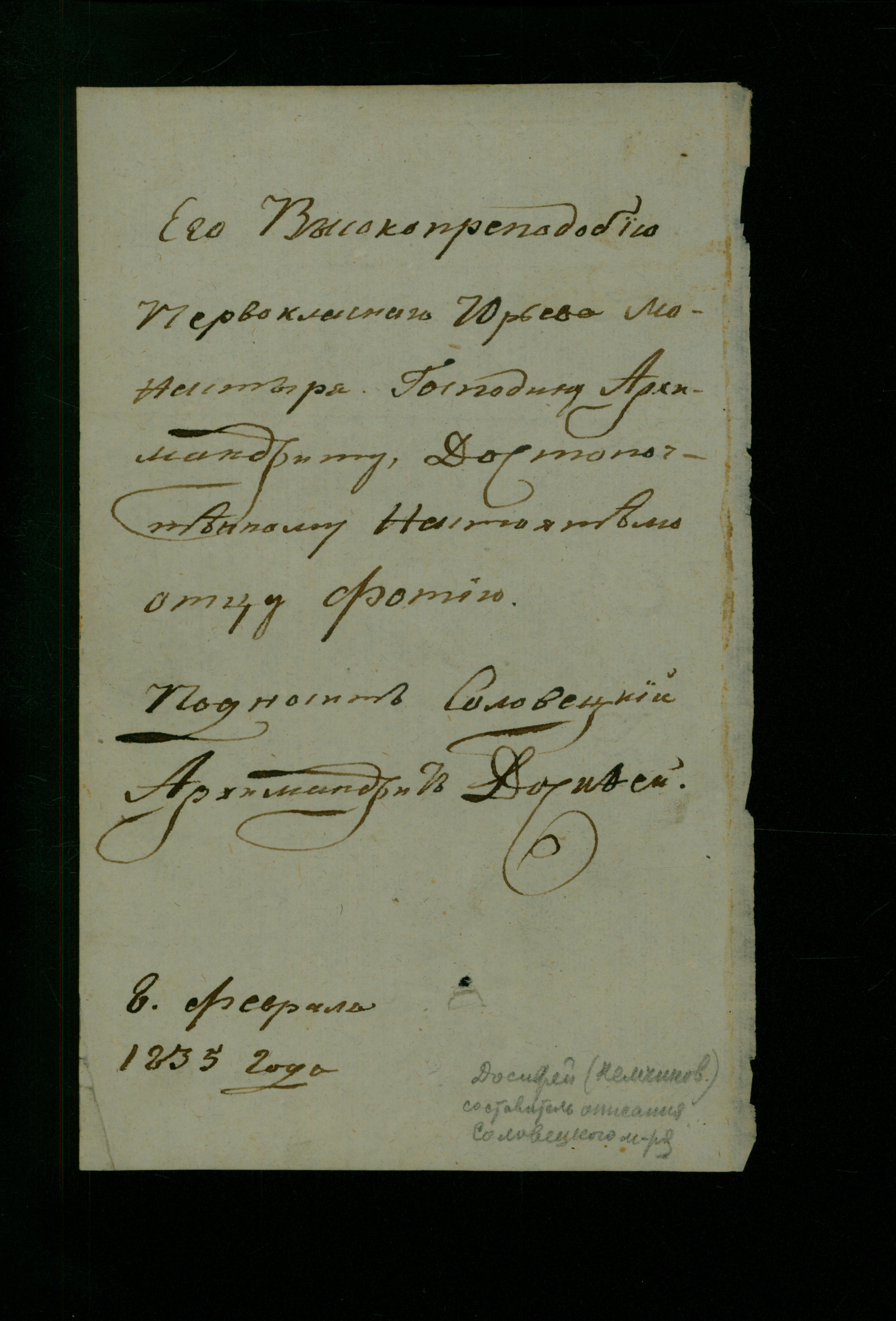 Записка настоятеля Соловецкого монастыря архимандрита Досифея настоятелю Юрьева монастыря архимандриту Фотию