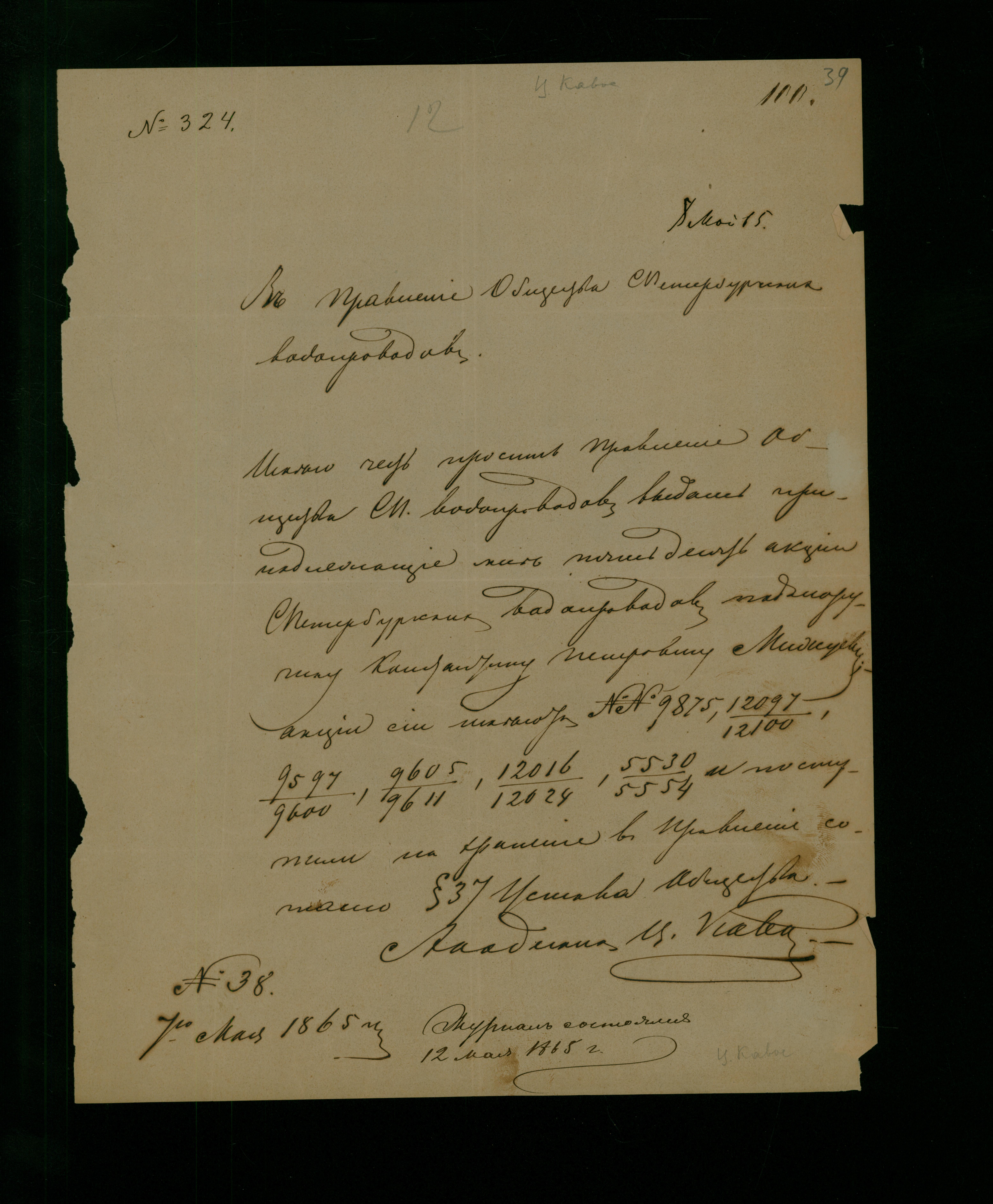 Письмо Ц. А. Кавоса в Правление общества Санкт-Петербургских водопроводов. 7 мая 1865 г. Архив СПбИИ РАН. РС. Кол. 226. Оп. 1. Ед. хр. 855. Л. 39