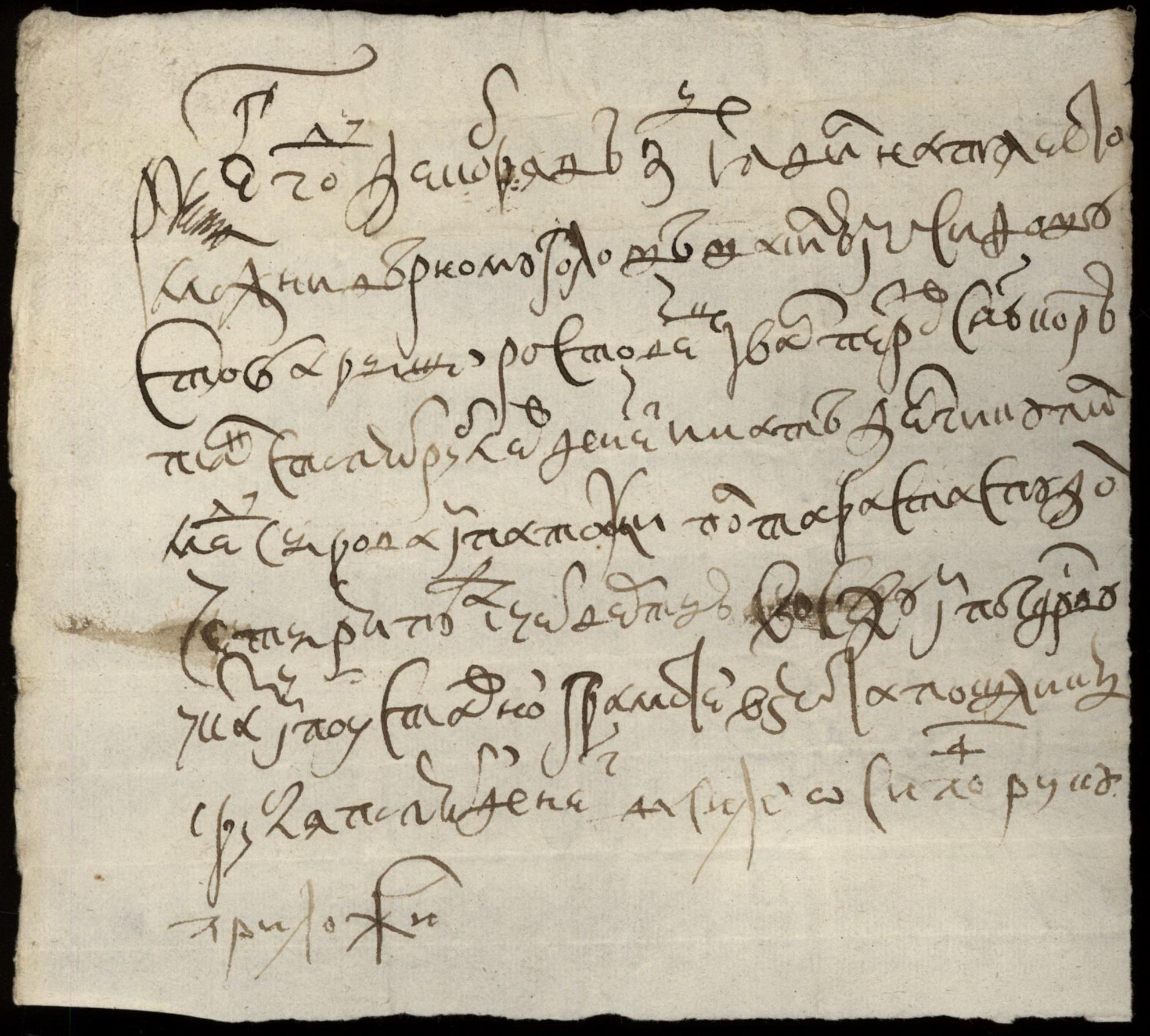 Выпись из таможенной книги города Тулы верного таможенного головы Василия Иосифова с товарищами ростовчанину Ивану Петрову сыну Коретану об уплате последним пошлины с купленных товаров. 1656 г. октябрь. Архив СПбИИ РАН. РС. Ф. 132. Оп. 1. Картон 4. Д. 221. Л. 1.