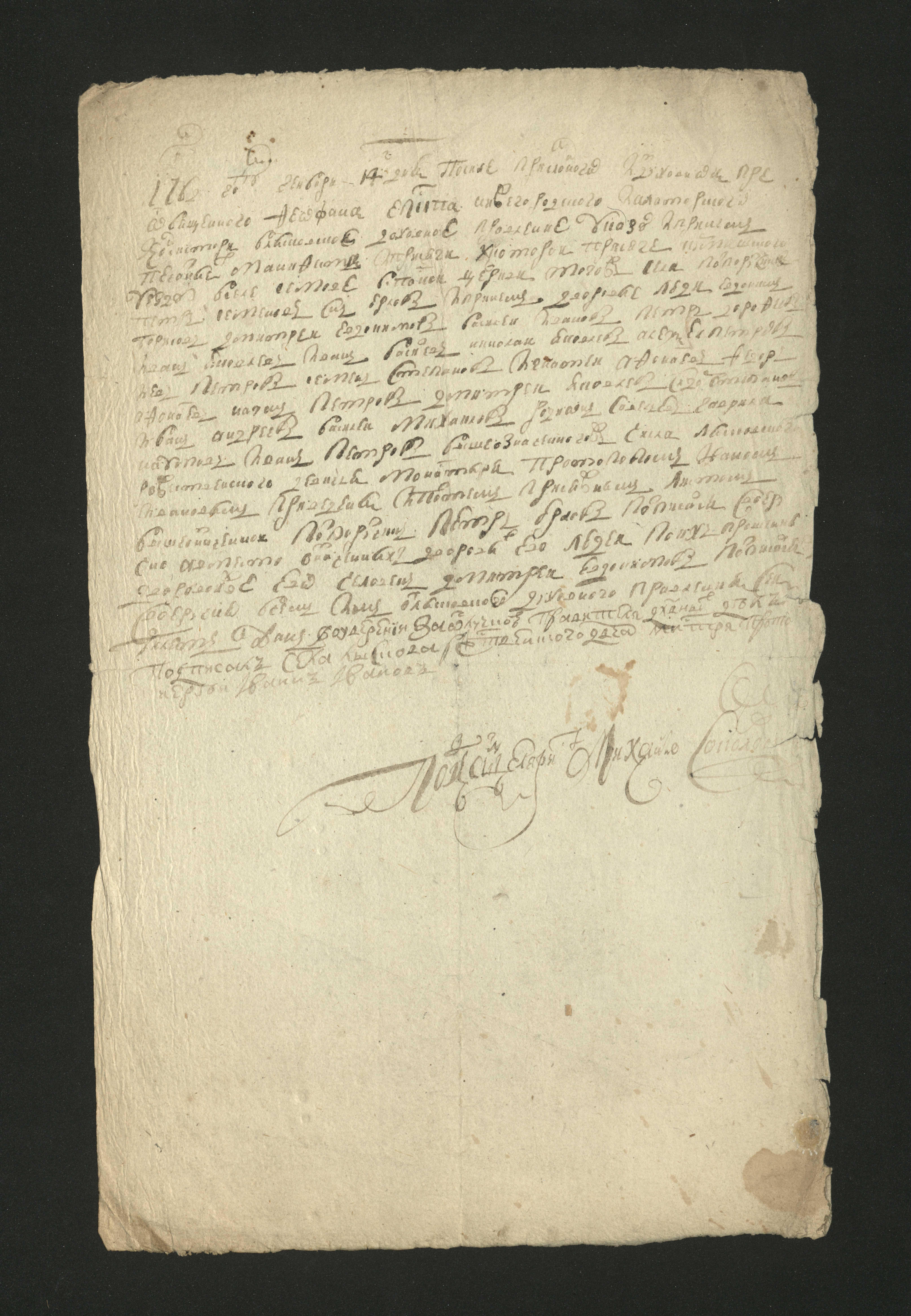 Замятия и точечные надрывы бумаги по внешнему полю. Продольный и поперечный сгибы по центру листа. Пятно в нижнем углу документа и загрязения по центру и нижней левой части на обороте