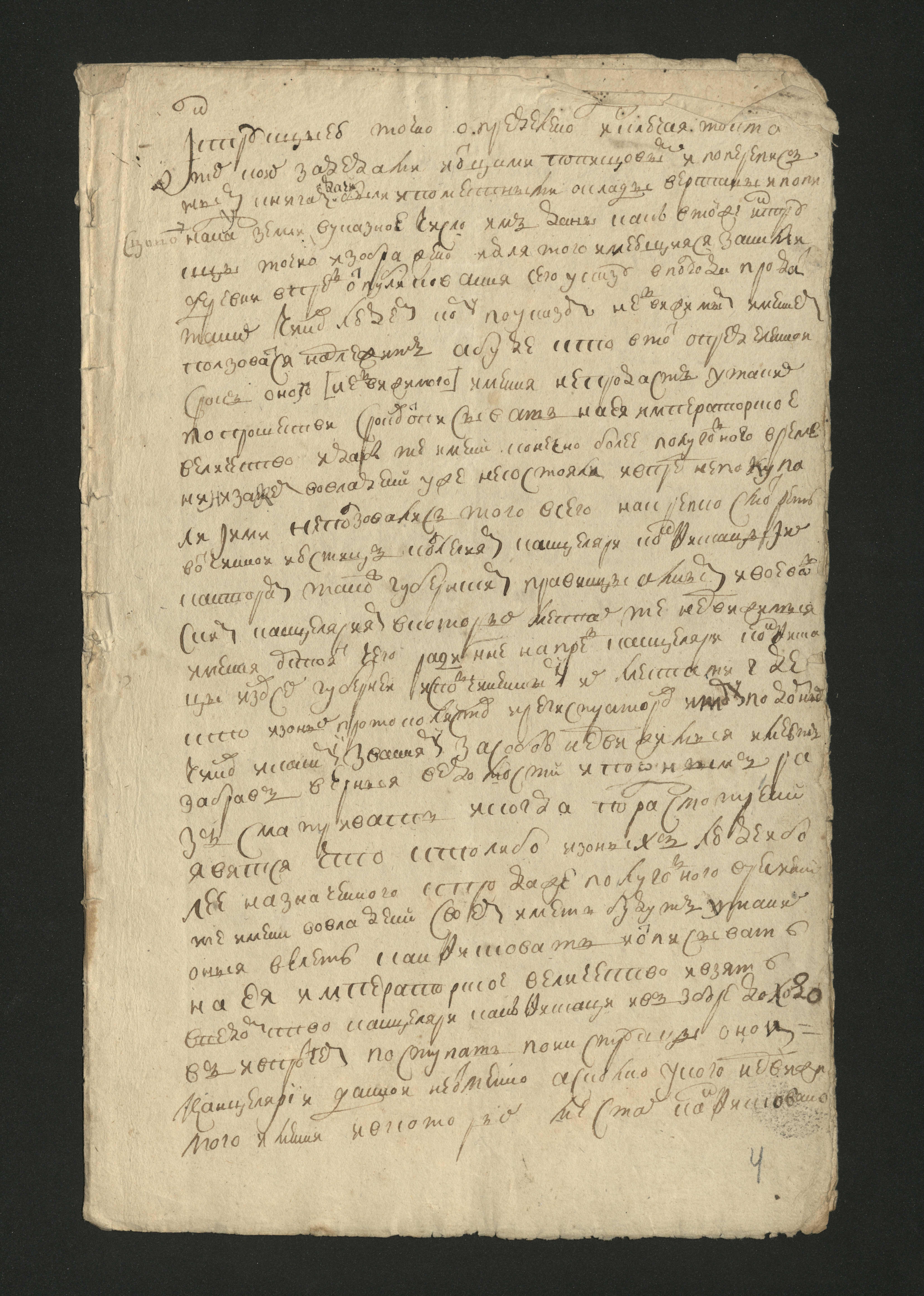Замятия и надрывы бумаги по внешнему полю всех листов, следы продольной и поперечной складок по центру листов, следы листания (отметки пальцев) в правом нижнем углу листов, л. 4 об. - загрязнения на месте складок