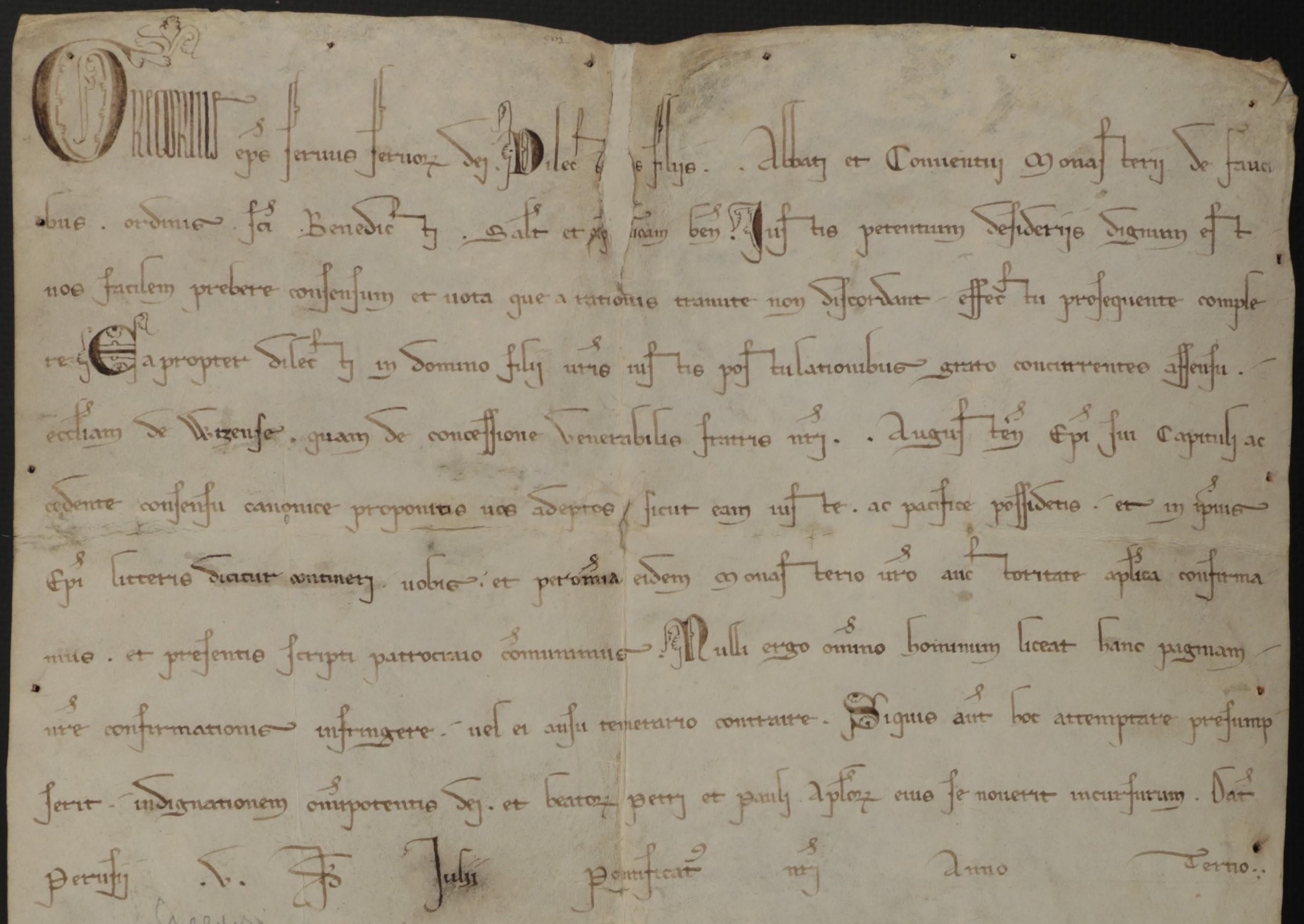 Линовка была выполнена, как это предписывалось для всех папских грамот, тупым ножом или острым стилосом по лицевой стороне (межстрочное расстояние – 13 мм). В данный момент глазу едва заметна.